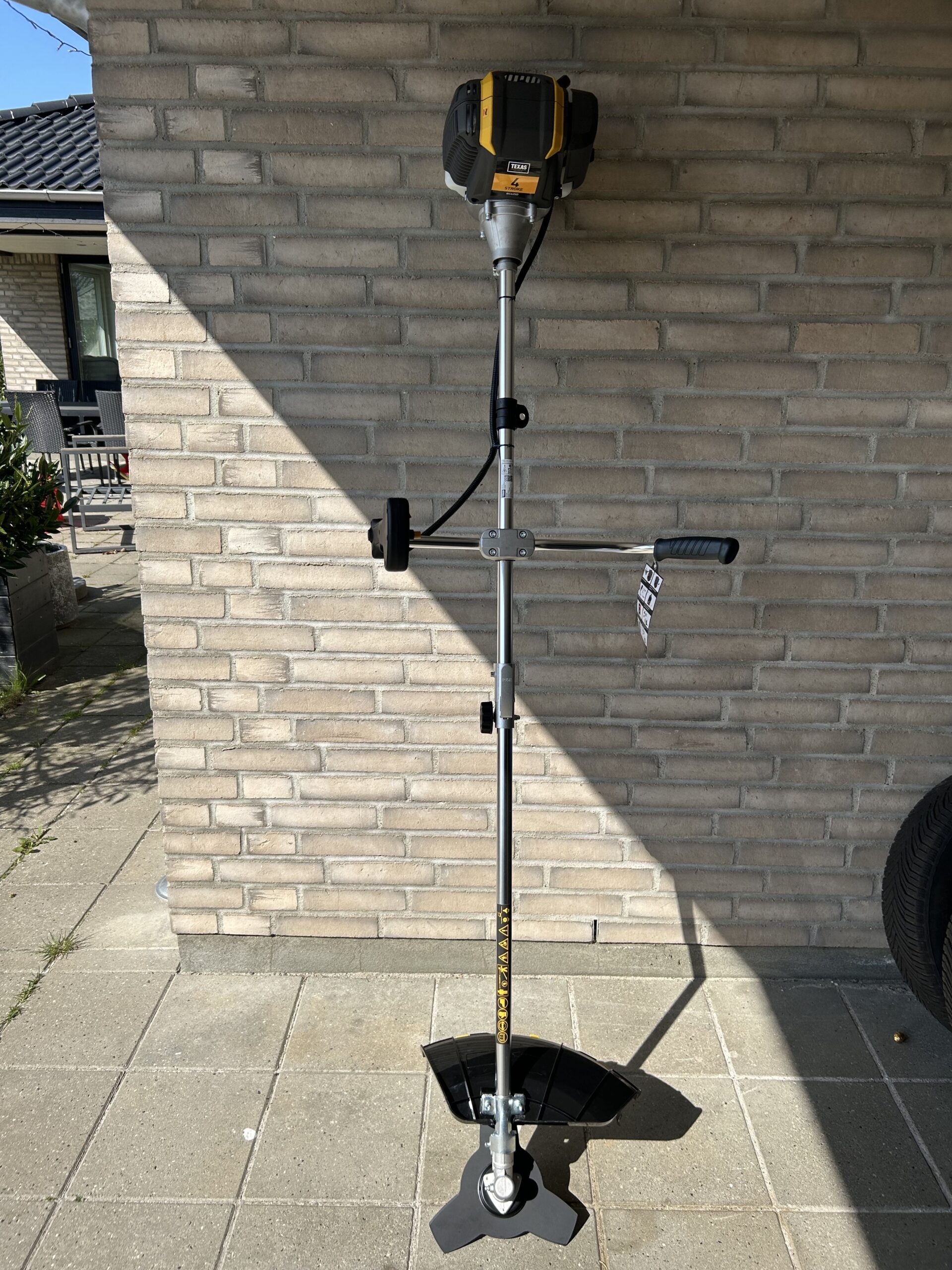 Den leveres med både trimmerspole og 3-tands klinge, så du hurtigt kan skifte mellem almindelig trimning og grovere arbejde. Den justerbare dobbeltsele og det cykelstyr-lignende håndtag sikrer god arbejdsstilling og reduceret belastning ved længere tids brug.